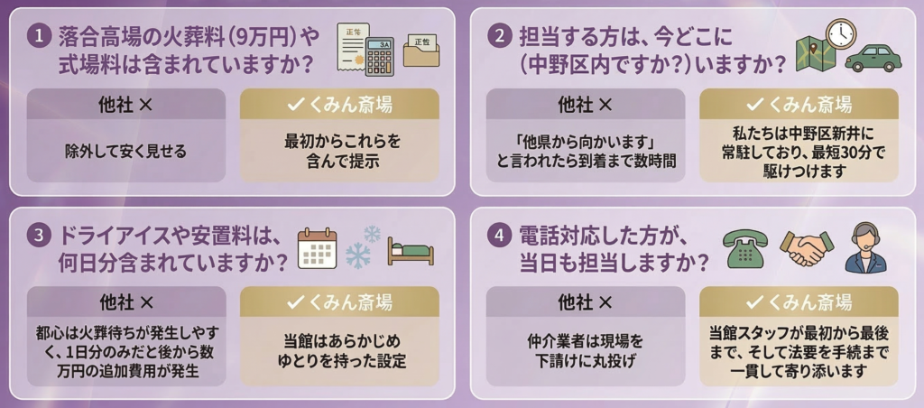 | 火葬料・式場料 | 広告価格に含まれない事が多い | 全てプラン内に「コミコミ」 |