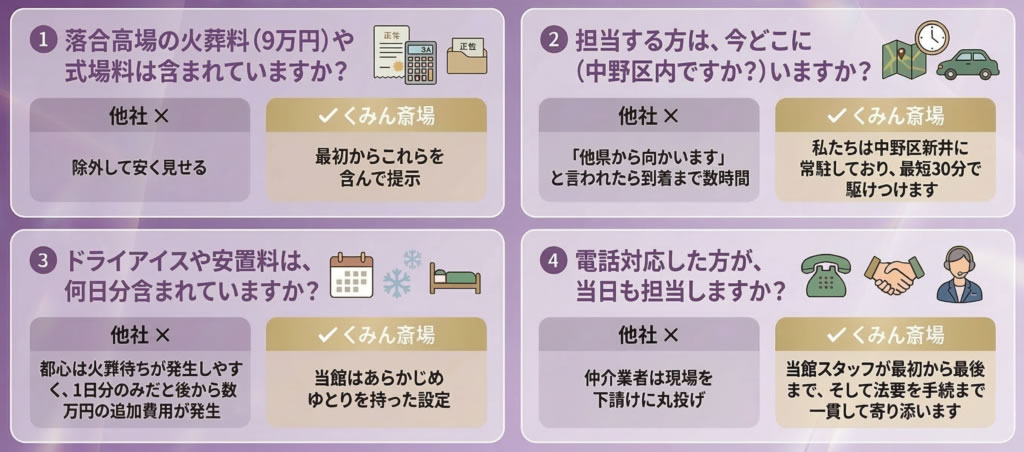 事前に資料を読み、実際にスタッフの声を聞くことで、「この人たちは中野の街に根を張り、自分たちの手で送ってくれるのか」という、業者選びの「本質」を見極めることができます。