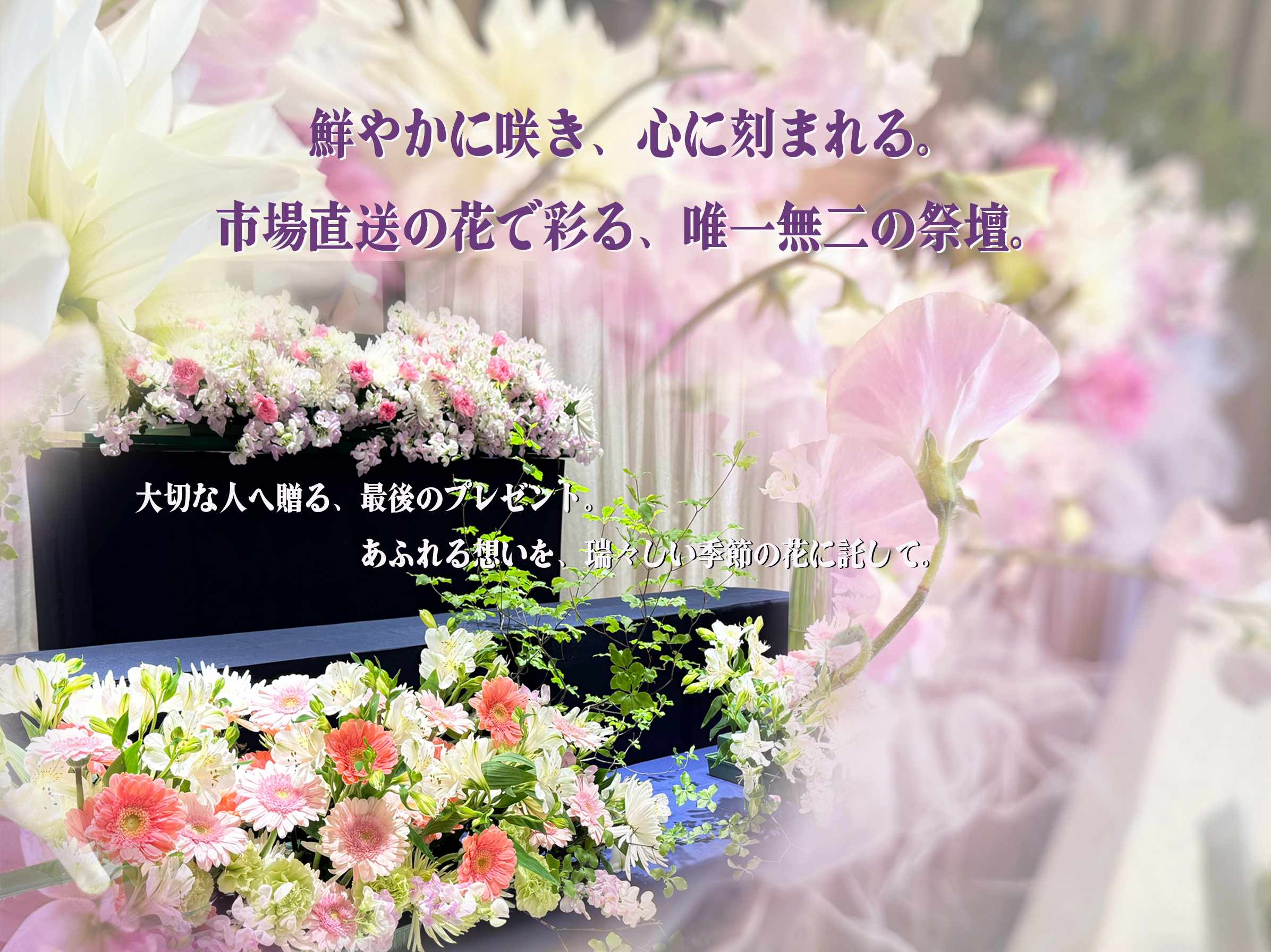 母体が「あすなろ葬祭」だからこそできる仕入れルート。市場から届く最高鮮度の花々で、美しい花祭壇をご用意します。