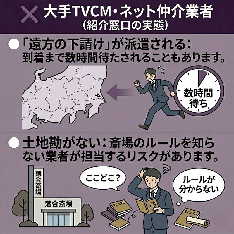 インターネットの普及により、今ではスマホ一つで葬儀社が選べる時代になりました。しかし、画面に並ぶ「最安値」の多くは、集客だけを行う紹介業者の広告です。事前に資料を取り寄せず、逝去後に慌てて電話をしてしまうと、「どこの誰が担当するかわからない」「提携している遠方の下請け業者が派遣される」といったリスクが生じます。