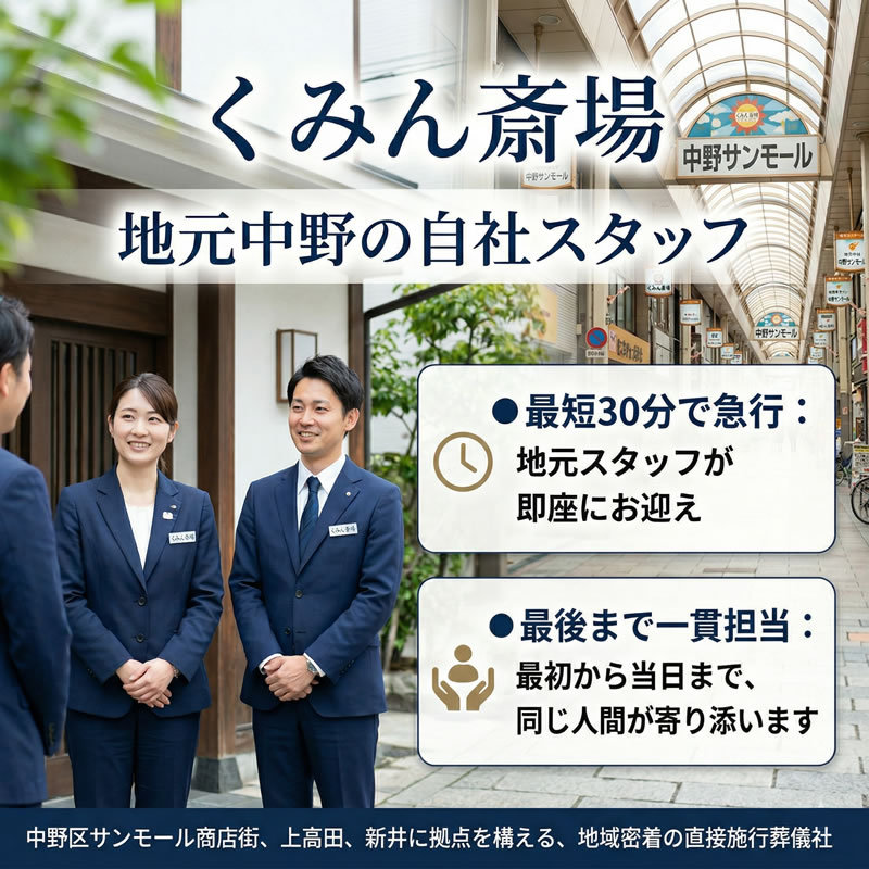 私たちは中野区サンモール商店街、上高田、新井に拠点を構える、地域密着の直接施行葬儀社です。