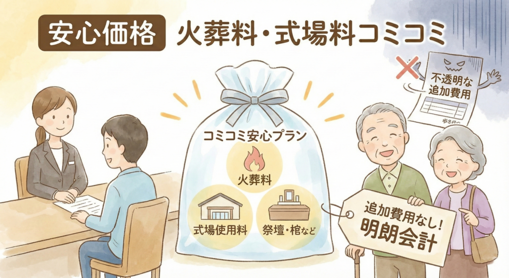 プラン料金には、他社で別料金になりがちな「火葬料」や「式場使用料」が含まれています。不透明な追加費用を排除した、分かりやすい明朗会計です。【コミコミプラン内容はこちら】