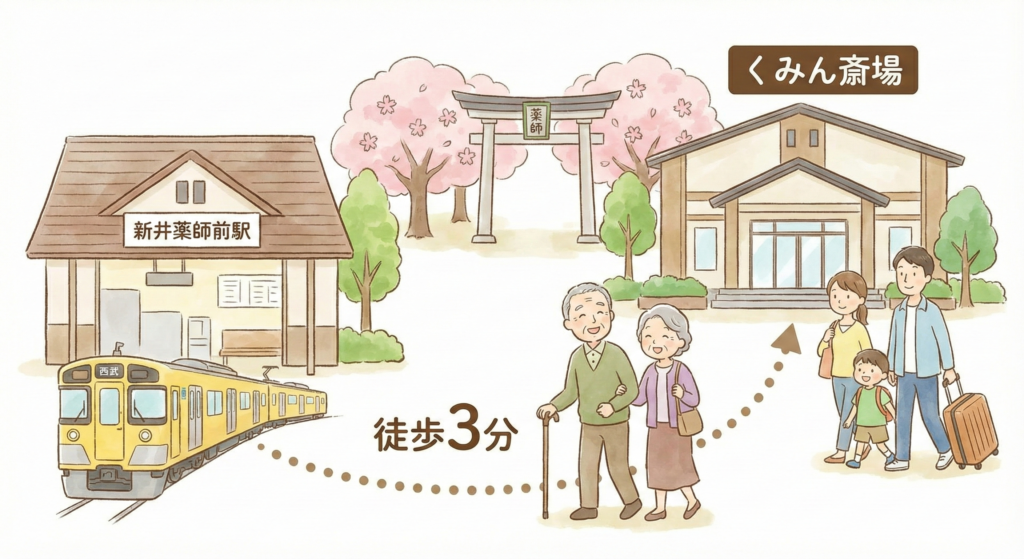 西武新宿線「新井薬師前駅」からすぐ。ご高齢の方や遠方からのご親戚も迷わずお越しいただける、安心の好立地です。